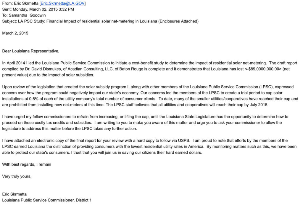 Skrmetta penned an email to Louisiana elected officials calling net metering a “solar subsidy program” and urged them to take legislative action, according to records obtained by the Energy and Policy Institute. He further admitted that he led the effort to “determine the impact of residential solar net-metering.”