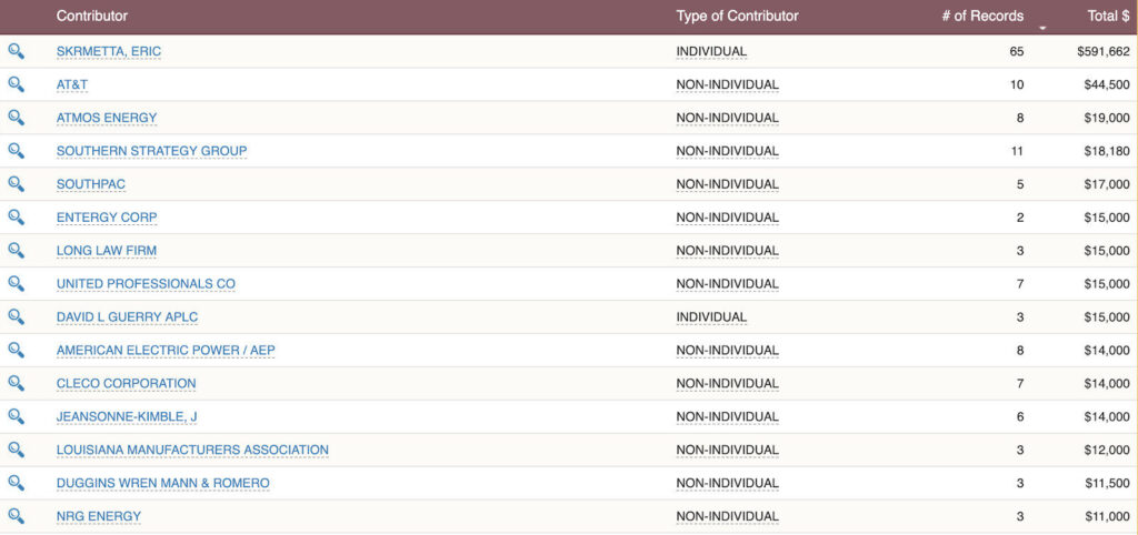 Skrmetta has taken more than $150,000 from electric utilities and the oil and gas industry, according to data from the National Institute on Money in Politics. Top electric utility contributors include Entergy, American Electric Power, and CLECO.